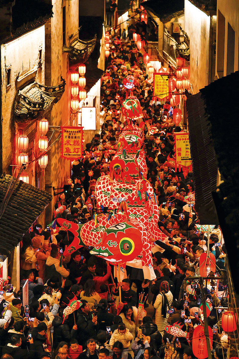在安徽省黄山市歙县北岸镇瞻淇村,村民舞动非遗鱼灯,吸引了众多游客(2024年12月31日摄) 施亚磊摄 / 本刊